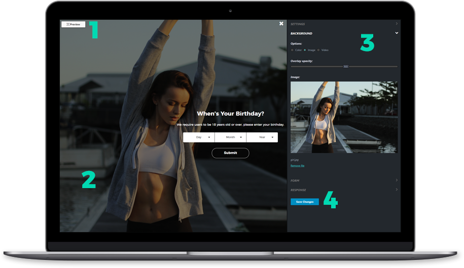 This section allows you to preview the age verification screen, the preview will update whenever you save some new changes.